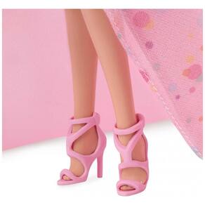 A boneca vem com um vestido longo em tule rosa, de comprimento até o chão, estampado com poás em cores de arco-íris e acabamento em camadas, trazendo bastante volume à saia. A parte superior tem mangas tipo borboleta (butterfly sleeves) e um laço grande aplicado na região dos ombros/torso, reforçando a estética de presente de aniversário. O look é completado por brincos de argola com brilho, sombra azul cintilante nos olhos e rabo de cavalo envolto (wraparound ponytail) no cabelo loiro.