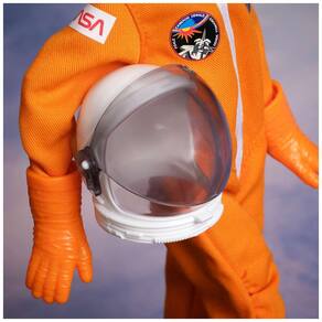 A boneca usa macacão laranja de voo espacial com modelagem utilitária e diversos patchs impressos que remetem a emblemas de missões e insígnias da NASA. O conjunto inclui botas, luvas removíveis e capacete rígido branco com viseira transparente, completando o visual de preparação para lançamento. O cabelo é mantido preso e bem rente à cabeça, com bastante gel para caber sob o capacete, podendo ser lavado pelo colecionador para deixar a textura mais solta conforme algumas avaliações de usuários.