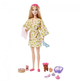 Esta boneca Barbie Dia de Spa da linha Self-Care foi desenvolvida para representar uma rotina de autocuidado em ambiente doméstico, com foco em banho, relaxamento e brincadeiras temáticas com acessórios de spa. O conjunto inclui boneca loira articulada, filhote de cachorro em miniatura e peças que simulam produtos de banho, permitindo encenar diferentes situações de cuidado pessoal e momentos de descanso.