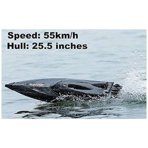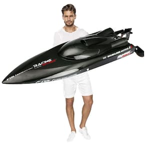 Este barco de alta velocidade para corridas é a versão multifuncional definitiva, com dimensões de 26 x 56 polegadas (65 x 121,5 cm). Recomendado para jogadores profissionais, não é adequado para iniciantes; para eles, sugerimos nossos barcos RC menores. Com um sistema automático de resfriamento a água, este barco se destaca em comparação aos modelos comuns de controle remoto, graças à sua circulação interna projetada. A superfície de inversão auto-corrigível garante que o casco mantenha sempre a face voltada para cima, tornando o controle fácil e intuitivo. O barco atinge uma impressionante velocidade de quase 55 km/h, proporcionando uma experiência emocionante que estimula todos os seus sentidos. Um aviso de baixa energia lembrará você de recarregar quando a bateria estiver acabando. O material do casco é feito de um FRP imitado, em plástico de alto brilho, todo na cor preta, garantindo durabilidade e um visual elegante. Experimente a adrenalina das corridas com este incrível barco de alta velocidade!