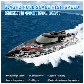 Este barco de controle remoto é equipado com funções avançadas, permitindo avançar, retroceder, virar à esquerda e à direita. Com luzes de navegação, ajuste de volume do leme (grande e pequeno), ajuste fino da direção, recuperação de capotamento e um sistema eletrônico de refrigeração a água, ele oferece uma experiência de uso completa. Com uma impressionante velocidade de 60 km/h, o barco conta com um motor sem escovas, refrigerado a água, que garante uma energia abundante, maior durabilidade e um desempenho estável, proporcionando uma experiência de jogo sem interrupções. O controle remoto opera na frequência de 2,4 GHz, assegurando uma conexão sem interferências e um sinal estável. O casco é fabricado em plástico ABS ecologicamente correto, tornando-o forte e durável, com um design simplificado que reduz a resistência da água. Além disso, a função de retorno de baixa tensão emite um sinal de alarme no controle remoto quando a energia está baixa, e as luzes LED facilitam a navegação noturna. Aproveite a velocidade e a tecnologia com este incrível barco de controle remoto!