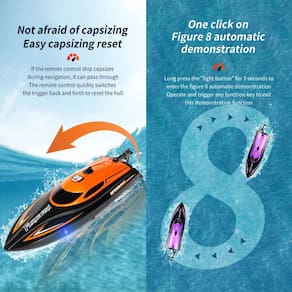 ?Barco RC de alta velocidade?O barco RC tem uma aparência legal e design científico de casco de baixa resistência, com um motor de alta potência, sua velocidade de viagem é de até 20 MPH ou mais, com 2 baterias recarregáveis de longa duração para proporcionar aos jogadores um entretenimento mais duradouro e experiência competitiva. - ?Barco RC de alta velocidade?O barco RC tem uma aparência legal e design científico de casco de baixa resistência, com um motor de alta potência, sua velocidade de viagem é de até 20 MPH ou mais, com 2 baterias recarregáveis de longa duração para proporcionar aos jogadores um entretenimento mais duradouro e experiência competitiva. - ?Função poderosa?Não só tem a função de demonstração de uma tecla na figura 8, mas também tem a função de autorrecuperação após virar, o que evita o problema da pesca manual. Com luzes LED brilhantes, torna a condução mais suave à noite e evita a perda do barco com controle remoto. - ?Fácil de controlar? O controle remoto adota tecnologia avançada de 2,4G, para que vários barcos RC não interfiram uns nos outros ao jogar ao mesmo tempo. O controle remoto tem uma distância de controle de 150 metros, e a distância de controle extra longa pode trazer aos jogadores uma experiência de jogo mais emocionante. - ?Durável?O interior do casco é projetado com função de resfriamento de água circulante, que pode resfriar continuamente o motor funcionando em alta velocidade durante o trabalho do barco RC, prolongando efetivamente a vida útil do motor; a tampa da cabine adota tecnologia avançada de vedação, para que o barco RC fique imerso em água por um longo tempo, a cabine não receberá água. - ?Presente e serviço?O barco de controle remoto de alta velocidade é um brinquedo aquático muito divertido para adultos e crianças, tem uma linda caixa de presente, que é a melhor escolha para presentear em vários festivais. Se você encontrar algum problema, com a RANFLY a tempo, ficaremos felizes em atendê-lo.