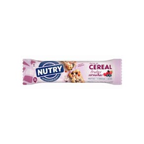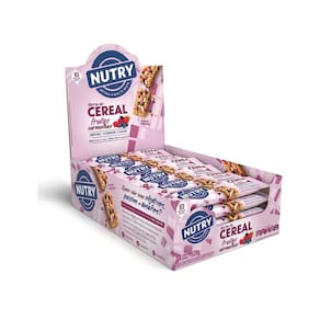 Barra de cereal Nutry sabor frutas vermelhas com biscoito de cacau, fruta + 3 cereais + cacau, com 22 gramas cada. Caixa contendo 24 unidades. Peso líquido total 528 gramas.