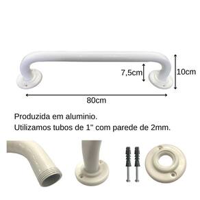 Barra De Apoio Alça Alumínio 80cm Idoso Deficiente Banheiro Cor: Branco Tamanho: 80 cm As barras de apoio ALO são produzidas em tubos de alumínio extrudados e de uma liga especial que proporciona uma grande resistência ao dispositivo de apoio. Conteúdo da embalagem: 1 Barra de apoio em alumínio de 80cm. 2 flanges de fixação em nylon. 4 Un parafuso Philips 4,8x45mm com bucha 8 Estas combinações de matérias primas tornam estas barras: resistentes, seguras, duráveis e pela qualidade dos acabamentos enobrece o ambiente onde forem instaladas. - Anodizadas - Tratadas contra oxidação - Resistentes à ação do vapor da água quente - Podem ser fixadas em qualquer posição - Sistema de recartilha que garante aderência da mão - Grande resistência - Grande aderência - Qualidade nos acabamentos - Sistema de fixação inteligente permite sua remoção sem deixar marcas nos revestimentos- Acompanha buchas e parafusos OBS: A fixação da mesma deve ser feita em paredes maciças que suportem os esforços que as mesmas receberão. Características do produto: Composição: Alumínio Higiene e Conservação: Pode ser lavada com água e qualquer tipo de sabão :3 Meses Disponível nos tamanhos: 30cm 40cm 60cm 80cm Especificações: - Marca: Alo - Modelo: Barra de apoio - Cor: Cromada - Tubo: Alumínio extrudado Em caso de dúvidas, seguimos à disposição pelo campo de perguntas. Dúvidas frequentes: - O produto tem - 3 meses de , contra defeitos de fabricação. Ean: 7902934431048