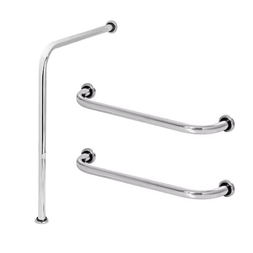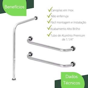 ESPECIFICAÇÕES TÉCNICA Material do Tubo: Alumínio Material das Arruelas de Fixação: Aço Inox Material das Canoplas: Aço Inox Acabamento: Polimento em Alta Temperatura Cor: Prata Alto Brilho Tipo de Fixação: Parafusos Quantidade de Fixação: 6 Parafusos Medidas entre eixos de fixação: 60Cm Diâmetro do tubo: 1.1/4, 3.17cm Kit de parafusos e buchas para instalação: SIM Padrão da NBR9050-2020: SIM Acabamento com canoplas de inox para esconder os parafusos, dando um lindo acabamento Peso suportado: 150Kg Conteúdo da Embalagem: 1 Barra de apoio em L 60x60, 2 Barras de Apoio Retas 60cm, Parafusos e Buchas