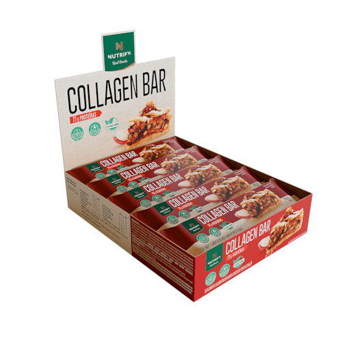 Collagen Bar é uma barrinha proteica diferente de todas que você já viu. Sua formulação conta com 2,5 g de colágeno bioativo VERISOL, valor recomendado para benefícios relacionados especialmente à pele e cabelos, além de ser rica em fibras e vitaminas importantes, como vit. A e vit. D. Toda essa densidade nutricional vem combinada a uma incrível experiência de sabor, em quatro versões que vão surpreender seu paladar sem aditivos artificiais: cheesecake de frutas vermelhas, torta de limão, brownie de chocolate e banoffee.