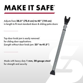 Barra de seguridad para puerta ajustable SABRE 2 en 1, barra tope que se asegura en la perilla de la puerta, con agarre fuerte y a prueba de rayones, estable contra el suelo, tapa removible de perilla para uso en puertas corredizas, portátil y fácil de usar. - PROTECCIÓN REFORZADA EN EL HOGAR: Evita entradas forzadas en puertas con bisagra, de patio y corredizas con esta barra de seguridad multiusos y resistente; solo para uso interior. - AJUSTABLE: Se ajusta desde 72,4 cm hasta 114 cm para adaptarse a la mayoría de puertas estándar y puertas corredizas de patio; la tapa de la perilla es fácil de remover para usar en puertas corredizas (longitud sin tapa: 63,5 cm a 105,4 cm). - DISEÑO DURADERO Y COMERCIAL: Fabricada con acero calibre 20 de 1 mm para resistencia y seguridad; la junta esférica pivotante asegura contacto total con el suelo para un ajuste seguro, mientras que la base acolchada proporciona un agarre fuerte sin rayar el piso. - INSTALACIÓN EN SEGUNDOS: No requiere herramientas; simplemente ajusta la barra usando los botones de liberación, coloca bajo la perilla con la junta esférica a unos 38-46 cm de la puerta (no colocar sobre alfombras o tapetes); recomendado para perillas y palancas, no para juegos de manijas. - PORTÁTIL Y COMPACTO: Diseño plegable fácil de almacenar, ideal para viajes, ofrece seguridad extra en hoteles, vacaciones o la oficina.