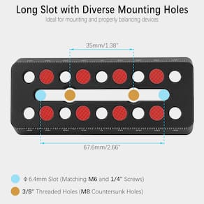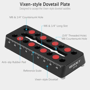?Placa de cauda de andorinha estilo Vixen? Projetada para aceitar as selas de cauda de andorinha estilo Vixen. ?Compartimento M6 M8 1/10.2 cm 3/20.3 cm? Com compartimento longo de 67,6 mm / 2,66" que é ideal para montar e equilibrar dispositivos adequadamente. O compartimento tem 6,4 mm de largura, o que aceita parafusos M6 e 1/10.2 cm. Além disso, existem dois orifícios roscados de 9,5 mm (orifícios escareados M8) com espaçamento de 35 mm. ?Furos escareados M6 e 1/10.2 cm? Existem 5 pares de furos escareados de 6,4 mm com espaçamento de 20 mm. Os orifícios escareados de 6,4 mm correspondem aos parafusos M6 e 1/10.2 cm. É ideal para anéis com furos roscados M6 ou 0,6 cm com espaçamento de 20 mm. ?Escala de referência? A placa de cauda de andorinha com escala de referência de incrementos de 1 mm em ambos os lados para facilitar os ajustes. ?Conexão segura antiderrapante?Oito almofadas de borracha antiderrapantes melhoram a aderência entre a placa de montagem e os dispositivos e protegem os dispositivos de qualquer dano devido à montagem. Quatro parafusos de parada de segurança na parte inferior para evitar quedas acidentais. (Observação: é necessário remover dois parafusos de parada de segurança para o selim que não suportam carregamento suspenso) - ?Placa de cauda de andorinha estilo Vixen? Projetada para aceitar as selas de cauda de andorinha estilo Vixen. - ?Compartimento longo com diversos orifícios de montagem? Com compartimento longo de 67,6 mm (2,66") ideal para montar e equilibrar dispositivos adequadamente. O compartimento tem 6,4 mm de largura, o que aceita parafusos M6 e 1/10.2 cm. Além disso, existem dois orifícios roscados de 3/20.3 cm (orifícios escareados M8) com espaçamento de 35 mm. - ?Furos escareados M6 e 1/10.2 cm? Existem 5 pares de furos escareados de 6,4 mm com espaçamento de 20 mm. Os orifícios escareados de 6,4 mm correspondem aos parafusos M6 e 1/10.2 cm. É ideal para anéis com furos roscados M6 ou 1/10.2 cm com espaçamento de 20 mm. - ?Escala de referência? A placa de cauda de andorinha com escala de referência de incrementos de 1 mm em ambos os lados para facilitar os ajustes. - ?Conexão segura antiderrapante?Oito almofadas de borracha antiderrapantes melhoram a aderência entre a placa de montagem e os dispositivos e protegem os dispositivos de qualquer dano devido à montagem. Quatro parafusos de parada de segurança na parte inferior para evitar quedas acidentais. (Observação: é necessário remover dois parafusos de parada de segurança para o selim que não suportam carregamento suspenso)