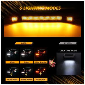 ATUALIZAR 6 MODOS DE ILUMINAÇÃO A barra de luz de 50 centimetros com 2 unidades de luz de 10 centimetros é muito adequada para luzes de advertência, faróis de nevoeiro, luzes de direção ou luzes de trabalho. Você pode alternar entre branco, âmbar, branco e âmbar, branco, flash, âmbar, flash e branco e âmbar, estroboscópio alternando o modo de luz.