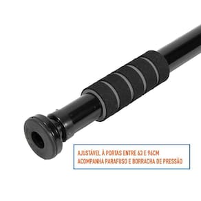 BARRA AJUSTAVEL - Possui sistema de pressão para fixação, adaptável a qualquer batente de porta entre 63 e 96cm. Sua estrutura em aço, material resistente que suporta até 100 kg, com pegada em espuma para maior conforto durante o exercício