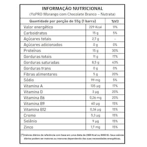 Além disso, ela possui cobertura de chocolate branco e recheio cremoso sabor chocolate branco, proporcionando uma experiência única de sabor a cada mordida. E o melhor de tudo: a Barra de Proteína Nutrata Yopro não contém glúten e contém lactose.