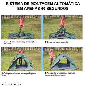 Características: Cor: Verde - Automática montagem em 1 minuto - Medidas: 260x260x170cm - Pode acomodar sentado 6-7 pessoas, dormindo confortavelmente 4-5. - 2 Portas e 2 Janelas além de tela no teto para ventilar. - Bolso interno porta treco -impermeável e protetor solar: proteção solar, proteção UV, tecido impermeável, sem medo de chuva.