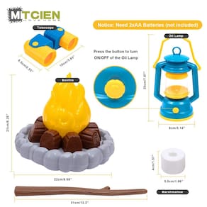 -?🗻 Conjunto de acampamento para crianças?- Imite uma fogueira selvagem com o som real da fogueira queimando, as verdadeiras chamas brilhantes e o canto de insetos ao ar livre. Acenda a lâmpada a óleo para descobrir o mistério da noite no escuro. (são necessárias duas pilhas 2AA, não incluídas) e manuseie os binóculos para ver fora de alcance durante o dia.