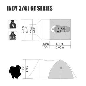 A barraca Indy GT 3/4 da Nautika é um dos modelos de barracas para até quatro pessoas com sobreteto completo. Possui duas portas com avancê abrigado completo para melhorar a ventilação e respiração durante a noite, e possui fechamento total para aumentar o espaço.