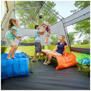 Malha Importado Fecho de zíper Lavar à mão Configuração instantânea de 60 segundos Acomoda 9 pessoas Se encaixa dois colchões de ar queen Altura Central 78 Tecnologia de bloco CORE H20 e ventilação de solo ajustável Possui divisor de quarto e bolsos de zenamento de parede para manter os itens arrumados e fora do chão da barraca Marca: Não Informado