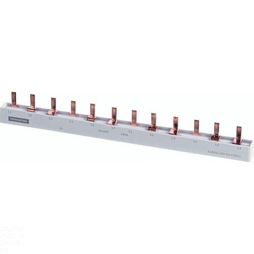 Leve qualidade e eficiência para seus projetos elétricos com o Barramento DIN 3 Fases 12 Polos Tramontina Tipo Pente 21 cm. Produzido com alta tecnologia, ele tem a função de distribuir a alimentação para os disjuntores Tramontina com maior segurança e praticidade. Garanta o seu e eleve o nível das suas instalações! Orientações . Características Gerais EAN13 7891435933048 DUN14 17891435933045 NCM 8544.49.00 Peso Líquido 0,0920 kg. Peso Bruto 0,0970 kg. Metragem 0,000050 m³. Dimensões Embalagem (Compr. X Larg. X Alt.) 223x 15x 15 mm. Dimensões Produto (Compr. X Larg. X Alt.) 225x 15x 15 mm. Cor 1 FFFFFFF Hexa Observações A instalação e segurança: É importante que o produto seja instalado por profissional habilitado. Antes de instalar, desligue a energia elétrica.
