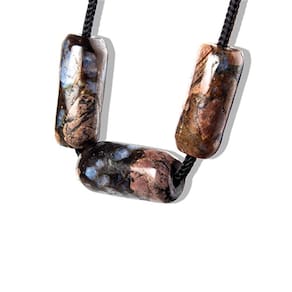 Nome: Riolita Rosa Natural Cor: Rosa suave com padrões marrons e brilho sutil (foto ilustrativa) Formato: Barril rolado com furo longitudinal (3 mm aprox.), ideal para fios e cordões Claridade: Semitransparente com brilho vítreo delicado Medidas: 25 a 30 mm (pode variar conforme o lote) Quantidade: 1 unidade