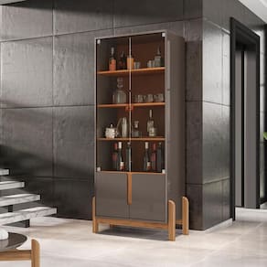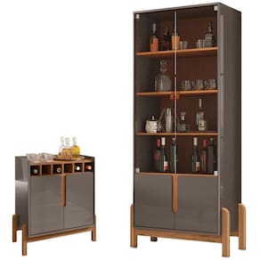 Barzinho 2 Portas 50522 E Cristaleira Para Sala 50519, com seu design moderno, irá levar versatilidade e charme à seu cômodo, seja ele sala de jantar ou sala de estar. Possuem estrutura em MDF de 15mm, MDP de 15mm e 25mm, o Barzinho possui 02 portas de MDF usinadas com detalhe curvo e dobradiças com sistema soft-close, para um fechamento mais suave, o que permite uma ótima experiência em seu uso diário, além disso, ele possui 06 adegas embutidas, para manter suas garrafas preferidas na posição horizontal. A Cristaleira possui 04 portas de abrir, sendo 02 em vidro, para armazenar da melhor forma suas taças e objetos de decoração. Ambas as pinturas contam com acabamento Print Wood, patenteado e exclusivo Casa D, garantindo aos produtos maior qualidade e durabilidade como nenhuma no mercado possui. Para maior segurança, os pés são elaborados em madeira maciça (Pinus) com pintura laqueada e sapatas para evitar riscos no piso no qual for instalado. Além de garantir um visual contemporâneo, tudo isso priorizando a segurança e o charme que seu ambiente necessita. Estes móveis chegarão em sua casa separados em 03 volumes.