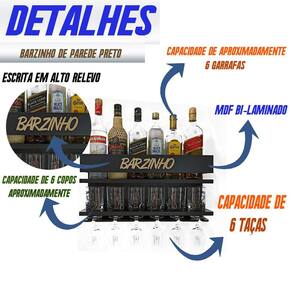 Principais características: Feito 100% em mdf 15mm bilaminado Capacidade aproximada para 6 garrafas + 6 copos + 6 taças Dimensões: 54cm de largura x 28cm de altura x 13cm de profundidade Acompanha parafusos e buchas para fixação.