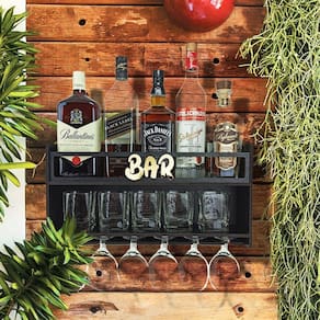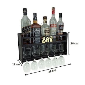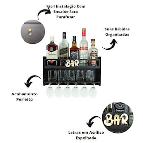 Barzinho de Parede Aparador Para Bebidas Para Sala Tema Bar - 49x26 Cor Preto BARZINHO DE PAREDE Com capacidade para 6 taças, copos e garrafas. DIMENSÕES: - Medida Total do Barzinho: 49 cm de comprimento x 26 cm de altura x 12 cm de profundidade- Espaço para copos : 46 cm de comprimento x 11,5 cm de altura x 11,5 de profundidade- Capacidade de taças : 6 taças-capacidade de copos: 5 copos Obs.: Acompanha 2 parafusos e 2 buchas para fixação na parede Qualquer dúvida estamos inteiramente a disposição para melhor lhe atender. Obrigado pela visita