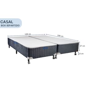 Características Gerais: - Largura: 138 cm (Duas bases divididas 69 cm ) - Comprimento: 188 cm - Suporta até : 150kg (cada lado) - Altura dos pés (cm): 13cm - Altura da base com pés: 40 cm / Altura sem os pés: 27 cm - Pezinhos: De madeira com rodizio - Revestimento: Tecido Suede Cinza Matelassado - Espessura madeira: 3cm - Estrutura: Com madeira de Pinus e Eucatex - Necessita montagem: Não, somente encaixe dos pés **Não acompanha Colchão, Vendido Separadamente** - Garantia: 12 meses