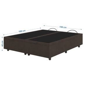 DIMENSÕES DA CAMA BOX BAÚ Altura total: 40 cm; Comprimento total: 158 cm; Largura total: 193cm; Altura Interna: 28 cm; Altura dos pés: 6 cm; Suporta até 120 Kgs por pessoa. Peso: 28kg.
