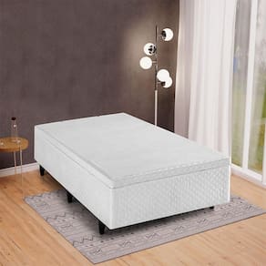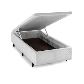 Cama solteiro com baú, abertura superior com sistema de molas, revestida em tecido 100% poliéster;