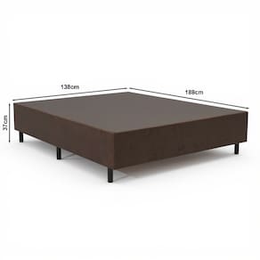 Ficha Técnica Detalhada: CaracterísticaEspecificaçãoProdutoBase para Cama BoxTamanhoCasal PadrãoCompatibilidade de Colchão138 cm x 188 cmCorMarromMedidas da Base (L x A x P)138 cm x 25 cm x 188 cmAltura dos Pés12 cmAltura Total (Base + Pés)37 cmMaterial da EstruturaMadeira de Eucalipto Reflorestada e TratadaRevestimentoTecido SuedeMaterial dos PésMadeira Maciça com Sapatas ProtetorasPeso SuportadoAté 150 kg por pessoa O que você vai receber: 1 Base para Cama Box Casal na cor Marrom1 Kit com 7 pés de madeira rosqueáveis OBSERVAÇÕES IMPORTANTES: