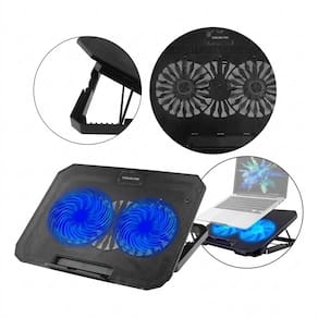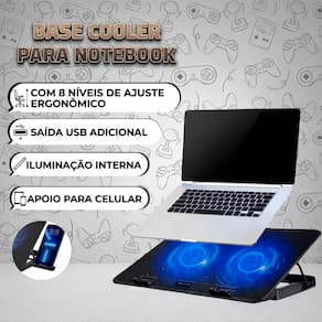 Base cooler com múltiplas ventoinhas de alta potência, iluminação LED azul, superfície em malha metálica, ajuste de inclinação, alimentação via USB, base antiderrapante e suporte lateral para celular.Vendido por Shophex e entregue por Casas Bahia