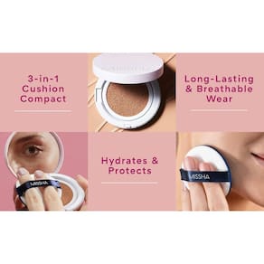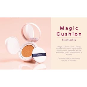 Capa de almofada M Magic, aderência duradoura, hidratação aprimorada. Aderência, cobertura, atualização duradoura. O pó Magic Fit é colocado em camadas limpas na parte superior. De longa duração sem escurecer, como se você tivesse acabado de se maquiar. O extrato vegetal dá uma aparência fresca e suave sem ressecar a pele. Enxugar levemente a esponja 1 a 2 vezes é suficiente para cobrir todo o rosto! Mesmo depois de vários usos, ainda há produto suficiente na esponja. Você não precisa virar tanto as laterais da esponja. Após o uso, a esponja não endurece, por isso fica sempre fresca.