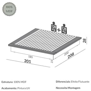 Características: Estrutura 100% MDF Acabamento em Pintura UV Sapatas Plásticas e Deslizantes Efeito Flutuante Estrados com Acabamento em Massa Bordas Arredondadas Ideal para Colchão King (193cm) NÃO ACOMPANHA COLCHÃO NÃO ACOMPANHA CABECEIRA