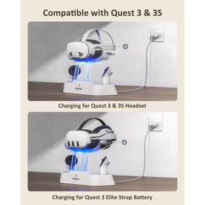 PortátilEspecificações: Entrada USB-C: 5V/4A Saída USB-A: 5V / 400mA Saída USB-A para fone de ouvido de carregamento: = 2000mA Saída da porta de carregamento do controlador: = 800mA x 2 Capacidade da bateria recarregável: 1850 mAh x 2 - ?Projetado para o jogador Elite?A base de carregamento NexiGo é projetada especificamente para carregar os fones de ouvido Quest 3 e 3S, controles e alça Elite com bateria. Com carregamento sem fio, é incrivelmente fácil carregar todos os seus dispositivos ao mesmo tempo para sessões de jogos ininterruptas. - Carregamento rápido: usando o adaptador de energia USB-C autêntico Quest 3 ou 3S 18W, o fone de ouvido VR pode ser totalmente carregado em apenas 4,4 horas e os controles atingem a capacidade total da bateria em apenas 3 horas. Diga adeus aos longos tempos de espera e desfrute de sessões de jogos ininterruptas com nossa solução de carregamento rápido. Carregue seu controle sem esforço sem remover a capa de silicone com os slots de carregamento fáceis de usar. - ?Indicadores LED convenientes?Projetado com indicadores de carregamento LED na coluna de suporte e nos lados esquerdo e direito da base para indicar o status de carregamento do fone de ouvido e controles acoplados. É fácil dizer quando seus acessórios estão carregados: laranja durante o carregamento e azul quando totalmente alimentado. - ?Proteção de carregamento?Esta base de carregamento oferece proteção abrangente para o seu controle e fone de ouvido durante o processo de carregamento. Inclui recursos de proteção contra sobrecarga, sobrecarga e sobrecorrente para garantir um carregamento seguro e confiável sem qualquer risco de danos ou mau funcionamento. Fique tranquilo sabendo que seus dispositivos estão protegidos durante o carregamento. - ?Economize tempo e dinheiro?Este pacote inclui baterias recarregáveis e capas de controle, eliminando a necessidade de substituição frequente de bateria. Aproveite a conveniência das baterias recarregáveis e economize tempo e dinheiro. O suporte armazena seu fone de ouvido Quest 3 ou 3S, alça Elite com bateria e controles de toque em um só lugar, mantendo sua área de jogo organizada.