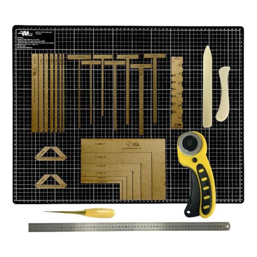 Kit com Base de Corte A1 90x60 Dupla Face Flexível Kit de Régua Para Encadernação Gabarito WireO Régua de inox 60cm Cortador Circular disco de 45mm Base de Corte A1 90x60x3mm Dupla face. Base de Corte Flexível fabricada em PVC emborrachado, tecnologia autocura, base autorregenerativa. Trabalhe com estilete, cortadores circulares sem riscar seus moveis. Marcações Nítidas de Centímetro, meio centímetro, polegadas, ângulos e graus. Cortador Rotativo Circular 45mm Tecidos, Papel, E.V.A entre outros. Cortador com Cabo plástico com formato anatômico. Melhor empunhadura, mais firmeza e precisão na hora do corte. Lâmina de 45mm super afiada. Possui trava de segurança. Pode ser utilizado por destros e canhotos. Trabalhe com Tecidos, Papel, E.V.A entre outros. Régua de aço inox de 60cm ideal de uso geral. Marcações em centímetros, milímetros e polegadas. Tamanho: 60 cm Largura: 2,6cm Kit Gabarito Régua Fio de Cabelo Esquadros T Cartonagem Wire O Kit completo com Réguas e gabaritos para encadernação composto por 23 itens. 7 Gabaritos com medidas de 6mmx30cm, 8mmx30cm, 10mmx30cm, 12mmx30, 15mmx30cm, 18mmx30cm, 20mmx30cm. 2 Réguas fio de Cabelo. 7 Esquadros com medidas de 30x22cm (largura 5cm), 25x17cm (Largura 4cm), 21x13cm (Largura 3cm), 18x10cm (Largura 2cm), 16x8cm (Largura 1,5cm), 14,5x6,5cm (Largura 1cm). 7 Gabaritos em T nas medidas de 6mmx32cm, 8mmx32cm, 10mmx32cm, 12mmx32cm, 15mmx32cm, 18mmx32cm, 20mmx32cm. 1 Gabarito para Wire-O (fio) 2x1 e 3x1. Medidas 2x1(Lado Direito): 5/8 120 Folhas, 3/4 140 Folhas, 7/8 180 Folhas, 1" 200 Folhas, 1 1/8 250 Folhas, 1 1/4 270 Folhas. Medidas 3x1 (Lado Esquerdo): 1/4 25 Folhas, 5/16 50 Folhas, 3/8 60 Folhas, 7/16 85 Folhas, 1/2 95 Folhas, 9/16 110 Folhas. Furador Agulhão Cartonagem Encadernação Cabo de Madeira Patchwork Furador Agulhão Cônico com cabo de madeira. Ideal para Cartonagem, Artesanato e patchwork. Ponta fina e super-resistente. Pode-se guiar tecidos por superfícies estreitas. 2 - Dobradores e Vincadores de papel e tecidos.