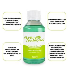 Contém: 01 - Esmalte de Tratamento Casco de Cavalo 150ml, Arte Sedução O Esmalte de Tratamento Casco de Cavalo da Arte Sedução é um poderoso tratamento desenvolvido para fortalecer e proteger unhas fracas, finas, quebradiças e que descamam com facilidade. Sua fórmula concentrada forma uma película resistente e protetora, que atua como um verdadeiro escudo, auxiliando no fortalecimento, na recuperação e no crescimento saudável das unhas. Inspirado na resistência do casco de cavalo, este esmalte de tratamento oferece mais firmeza e dureza às unhas, prevenindo quebras, rachaduras e lascas, além de contribuir com unhas mais fortes, saudáveis e bonitas. Com a embalagem econômica de 150ml, é ideal para em salões de beleza ou para quem busca alto rendimento no cuidado com as unhas em casa. Características Principais: - 150ml; - Fortalece e endurece unhas fracas, quebradiças e finas; - Cria uma película protetora resistente; - Estimula o crescimento saudável das unhas; - Previne quebras, rachaduras e descamações; - Pode ser como base antes da esmaltação ou como tratamento diário; - Ideal para ou para quem cuida das próprias unhas em casa; - Excelente custo-benefício. Marca: Não Informado Ean: 7899531424187