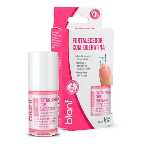 A Base Fortalecedora Para Unhas Blant Com Queratina foi desenvolvida especialmente para unhas fracas e quebradiças. Forma um fina película de alta resistência e proteção às unhas, além de recuperar as partes danificadas. Também pode ser usada como base durante a esmaltação. Sua fórmula foi desenvolvida com base Gel 4free, que garante alta resistência, maior durabilidade nas unhas e secagem rápida. Graças ao pincel plano profissional, a aplicação é rápida e fácil.