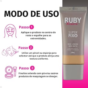 A Base Líquida Super Fixo da Ruby Kisses é sinônimo de pele bem preparada e com aspecto natural. Com toque seco e acabamento semi-matte, ela proporciona um aspecto aveludado para a pele. Sua nova fórmula contém Ácido Hialurônico, Pantenol e Vitamina E, que possuem ação antioxidante e hidratante. Possui fórmula de média cobertura, que permite a construção de camadas, e performance de longa duração .