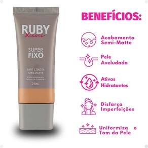A Base Líquida Super Fixo da Ruby Kisses é sinônimo de pele bem preparada e com aspecto natural. Com toque seco e acabamento semi-matte, ela proporciona um aspecto aveludado para a pele. Sua nova fórmula contém Ácido Hialurônico, Pantenol e Vitamina E, que possuem ação antioxidante e hidratante. Possui fórmula de média cobertura, que permite a construção de camadas, e performance de longa duração .