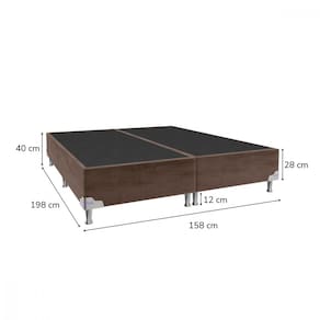 Caracter?sticas: - Altura do box sem p?s: 28 cm - Material da estrutura: Madeira em Pinus 4 mm - Colch?o : 158x198 cm -n?o incluso- - Tecido: Sued - Bipartido - Modelo do Box: Vazado - N?o possui anti-derrapante - N?o possui tratamento anti-cupim - 12 p?s fixos de 12 cm -kit p?s estar? armazenado dentro do TNT- - Suporte de peso: 120 kg por m?dulo - Tempo de garantia: 3 meses