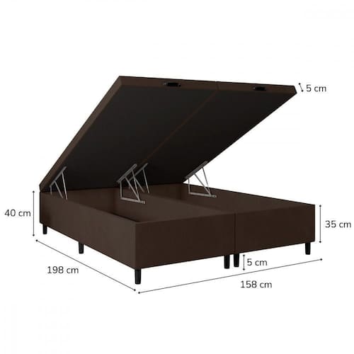 Base Para Cama Box Queen Com Baú 158x198x35 Marrom Portobel Marrom Transforme seu quarto com a cama box queen com bau, a combinacao perfeita de conforto e funcionalidade. Este modelo elegante oferece um design moderno e clean, alem de um amplo espaco de armazenamento para organizar suas roupas de cama, travesseiros e outros itens. Nao perca a oportunidade de otimizar seu espaco e elevar a decoracao do seu ambiente. Adquira ja a sua cama box queen com bau e aproveite o melhor do design e conforto! Dimensoes: Altura (com pes): 40 cm | Largura: 158 cm | Comprimento: 198 cm
