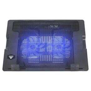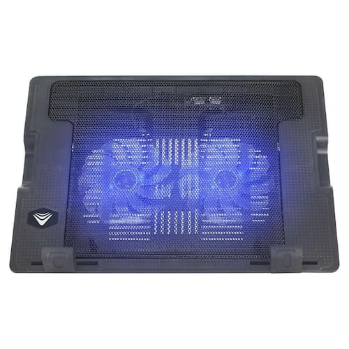 02 ventiladores de 120mm com iluminação LED azul, baixo ruído, design leve e fino, pés antiderrapantes, haste de inclinação em 3 níveis, superfície em malha de metal, travas de apoio emborrachadas e ajustáveis, conexão USB para alimentação, 1 porta USB extra, botão liga/desliga.Tipo