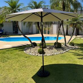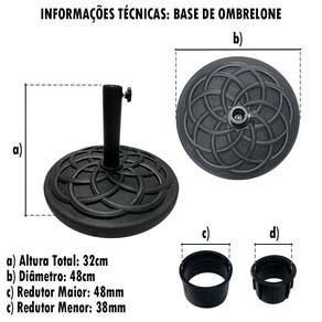 Com 48 cm de diâmetro e 19 kg, ela proporciona sustentação firme mesmo em áreas expostas ao vento. Seu encaixe é compatível com hastes de 38 mm a 48 mm, atendendo diferentes modelos de ombrelones com segurança e precisão.
