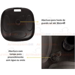 Produzida em polietileno, ela pode ser preenchida com 18l de água ou 22kg de areia para fixar seu guarda-sol em qualquer lugar.