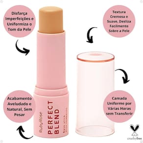 A Base Stick Ruby Rose Perfect Blend FS50 oferece cobertura de média a alta, permitindo construir camadas para um resultado mais intenso ou mais leve, conforme a necessidade.