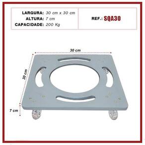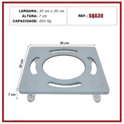 Base Suporte De Alumínio Quadrado Com Rodízios Gel Vaso 30Cm Suporte de alumínio Quadrado com rodinhas de silicone gel anti-risco e anti ruido. Ideal para facilitar a locomoção de objetos em geral, como vasos de plantas, eletrônicos, eletrodomésticos, entre outros. Em qualquer ambiente, sem ruídos e sem riscar ou danificar o seu piso. 4 rodízios giratórios - suportam até 200 kg. Modelo SQA30 Medidas técnicas do suporte: Altura total: 7 cm; Largura da base: 30x30 cm; Medidas técnicas do rodízio: Contém 4 rodas Diâmetro da roda: 50 mm; Vantagens: · grande durabilidade e resistência; · não enferrujam; · não riscam; · antirruídos; · suportam grande quantidade de peso Ean: 7898679670715
