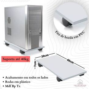Base Suporte De Cpu Computador Branco Com Rodas Em Mdf Basic Este suporte para CPU é uma solução prática e econômica para manter sua CPU segura e organizada. O design permite fácil movimentação da CPU, ajuda a proteger contra danos causados por poeira e umidade. além disso, o suporte para CPU ajuda a manter o seu espaço de trabalho organizado e livre de bagunça. Dimensões: Altura: 7 cm suporte + rodízio Comprimento: 40 cm Profundidade: 20 cm Espessura do MDF: 15 mm Especificações técnicas: Suporta 40 Kg de carga com Segurança. Acabamento do próprio MDF. Fita de borda PVC colada. Acompanha parafusos e rodízios. Embalagem segura para que receba seu produto em perfeito estado. Segurança da compra com vendedor de ótima qualificação e no ramo de atuação Marca: Não Informado