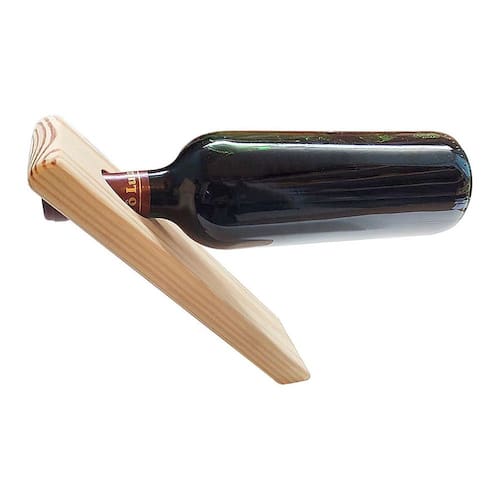 Suporte de madeira para vinhos que se equilibra com o peso da garrafa.