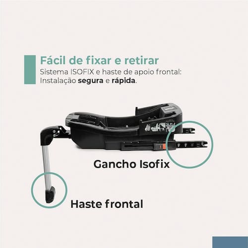 Características principais: • Instalação fácil e segura com sistema Isofix e haste frontal; • Sistema de engate e desengate do bebê conforto, projetado para facilitar o dia a dia dos pais; • Sinalização de instalação correta que fica verde, garantindo a fixação; • Base Zion Isofix: instalação prática, segurança visível, cuidado garantido.
