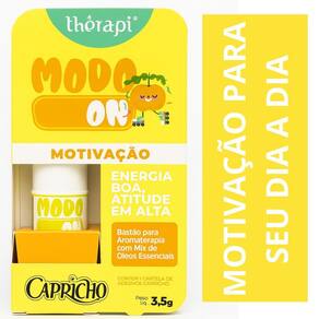 c mix de oleos essencias modo on motivação 3,5g therapi capricho Energia boa, atitude em alta. Bateu aquela preguiça Falta de ânimo pra começar o dia, os estudos ou qualquer plano Modo on é o empurrãozinho que você precisa pra sair do modo soneca e ativar seu brilho. Com ingredientes naturais e cheios de energia leve, ele desperta sua vontade de fazer acontecer - do seu jeito, no seu ritmo. Porque motivação também se cultiva. E a gente faz isso com estilo e propósito. =========== Composição português : triglicerídeo caprílico/cáprico, cera de abelha sintética, cera de carnaúba sintética, óleo de soja, óleo de coco, cera microcristalina, de cacau, óleo essencial de laranja doce, óleo essencial de cravo, óleo essencial de bergamota, óleo essencial de lavanda, de karité, óleo de amêndoa doce, fenoxietanol, caprililglicol, bht, citral, d-limoneno, eugenol, linalol. =========== Modo de uso: aplique o produto nas áreas desejadas, como pulsos e pescoço massageando o local com a ponta dos dedos. Anvisa: 25351.091061/2025-85