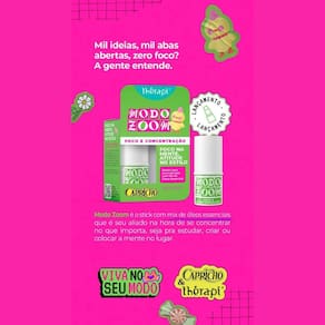 com mix de oleos essencias modo zoom foco e concentração 3,5g therapi capricho Foco na mente, atitude no estilo. Mil ideias, mil abas abertas, zero foco A gente entende. Modo zoom é seu aliado na hora de se concentrar no que importa - seja pra estudar, criar ou colocar a mente no lugar. Com ingredientes naturais, veganos e sem testes em animais, te ajuda a organizar os pensamentos, sem perder o brilho. Foco também é autocuidado e aqui, a gente faz isso com personalidade. ========== Composição português : triglicerídeo caprílico/cáprico, cera de abelha sintética, cera de carnaúba sintética, óleo de soja, óleo de coco, cera microcristalina, de cacau, óleo essencial de laranja doce, óleo essencial de cravo, óleo essencial de bergamota, óleo essencial de lavanda, de karité, óleo de amêndoa doce, fenoxietanol, caprililglicol, bht, citral, d-limoneno, eugenol, linalol. ========== Modo de uso: aplique o produto nas áreas desejadas, como pulsos e pescoço massageando o local com a ponta dos dedos. Anvisa: 25351.091886/2025-08