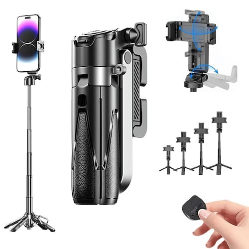 Este de Selfie Retrátil 360 para SmartPhones com Mini Tripé e Controle Remoto é confortável e ergonômico para fotografia e gravação de Vlog, transmissão streaming, selfies ou fotos de grupo, segura seu SmartPhone como uma câmera e reduz a trepidação ao tirar fotos ou gravar vídeos. Equipado com uma haste telescópica ajustável de 6 seções com uma faixa ajustável de 11.7cm a 41.5cm, você pode definir livremente a altura de acordo com suas necessidades e lidar perfeitamente com diferentes cenas. O de Selfie para Celular pesa apenas 137 gramas e tem apenas o tamanho de uma palma após dobrar e pode caber facilmente no seu bolso ou bolsa. Além disso, vem com um mosquetão para prendê-lo convenientemente à sua mochila, que é fácil de transportar e pronto para fotografar a qualquer hora, em qualquer lugar, conveniente e rápidoO de Mini Selfie Stick Retrátil 360 possui 4 modos de uso para atender a diferentes necessidades de fotografia. Modo SLR: pegada firme, trazendo a sensação de uma Câmera DSLR , fácil de operar com uma mão. Modo de Selfie: tire fotos de grupo facilmente. Modo Tripé: adequado para fotografia estática ou gravação de vídeo. Modo Suporte para Celular: fácil de assistir ou transmitir . Seja para fotos de viagem ou selfies diárias, o para SmartPhones pode ajudá-lo a capturar facilmente momentos maravilhosos.Equipado com 2 interfaces de sapata fria para fixar microfones e luzes de preenchimento, o que é especialmente adequado para gravação de vídeo e transmissão . Seu Suporte para SmartPhones possui rotação de 360 e ajuste de ângulo de 225, garantindo que você possa ajustar facilmente o melhor ângulo de disparo, seja ele Vertical ou Horizontal, sempre tire uma foto perfeita.O Mini Tripé deste de Selfie Retrátil 360 para SmartPhones possui haste telescópica de liga de alumínio, sendo resistente garantem estabilidade e durabilidade e fornecem excelente suporte mesmo em ambientes diferentes. O design de 4 pernas adiciona estabilidade extra para garantir que ele possa ficar em pé, mesmo no gramado, para evitar tremer durante as filmagens. Muito fácil de usar, basta pressionar o botão na parte inferior para desbloquear as 4 pernas do tripéEquipado com um Controle Remoto sem fio via Bluetooth 5.2 se com alcance de 10 metros, o Controle Remoto tem 2 posições fixas para se adaptar a diferentes cenários de uso. Operação simples, fácil de controlar a filmagem com uma mão, sem ajuda adicional, capture cada momento bonito a qualquer momento.Suporta a maioria dos SmartPhones Largura de 6cm a 8.5cm